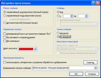 Параметры настройки просмотра презентации изменяются с помощью диалогового окна Настройка презентации.