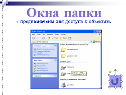 Выведите на экран слайд «Окна папки» . Выберите в списке управляющую кнопку Возврат. Определите размер кнопки протягиванием с помощью мыши в нужном месте слайда, например, так: