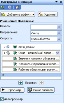 В области Настройка анимации перетащите второй эффект (для окна) на первое место в списке эффектов ( на первом месте должен быть заголовок).