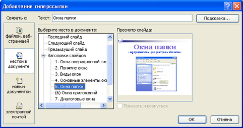Выведите на экран слайд «Виды окон» . Выделите текст «Окна папки» . Выполните команду меню Вставка - Гиперссылка. В области Связать с выберите местом в этом документе, выделите в списке строку с названием слайда «Окна папки» . Нажмите ОК.