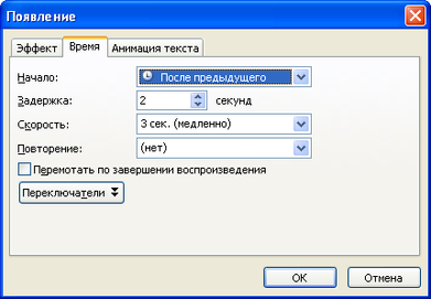 На вкладке Время: Начало – после предыдущего; Задержка – 2 сек.;