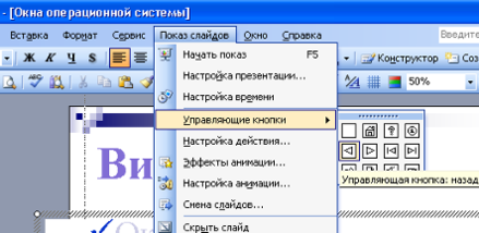 Второй способ состоит в размещении на слайдах кнопок, по щелчку на которых происходит некоторое событие, например переход на определенный слайд. Созданные нами гиперссылки реализуют переход со слайда «Виды окон» на конкретные слайды презентации. Теперь необходимо создать элементы, осуществляющие возврат на исходный слайд. Программа Power point предлагает набор кнопок для выбора по команде меню Показ слайдов – Управляющие кнопки. Каждой кнопке в списке уже присвоено определенное действие, при зависании указателя мыши на кнопке всплывает подсказка, содержащая название типа кнопки.
