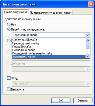 После создания кнопки на экране появляется окно Настройка действия, позволяющее изменить (если это нужно) заданное для данной кнопки действие. Для данной кнопки указано действие – Перейти по гиперссылке: Последний показанный слайд.