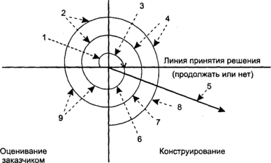 Рис. 3. Спиральная модель: 1 - начальный сбор требований и планирование проекта; 2 - та же работа, но на основе рекомендаций заказчика; 3 - анализ риска на основе начальных требований; 4 - анализ риска на основе реакции заказчика; 5 - переход к комплексной системе; б - начальный макет системы; 7 - следующий уровень макета; 8 - сконструированная система; 9 - оценивание заказчиком.