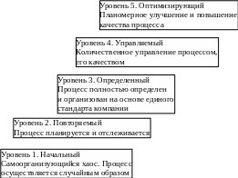 Очень важно отметить, что модель СММ ориентирована на построение системы постоянного улучшения процессов. В ней зафиксированы пять уровней зрелости (рис.5) и предусмотрен плавный, поэтапный подход к совершенствованию процессов - можно поэтапно получать подтверждения об улучшении процессов после каждого уровня зрелости.