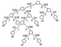 Для наглядности построим кодовое дерево. Из точки, соответствующей вероятности 1, направляем две ветви, причем ветви с большей вероятностью присваиваем символ 1, а с меньшей 0.