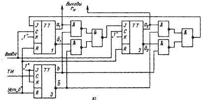 Пример 40. Рассмотрим процесс исправления единичной ошибки при использовании кода (7,4) с образующим многочленом g(x) = х3 + х2 + 1 и применении в декодирующем устройстве схем деления за n и k тактов.