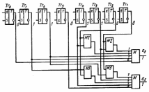 Обратные связи регистра соответствуют виду многочлена g(x). Количество включаемых в него сумматоров равно числу отличных от нуля коэффициентов g(x), уменьшенному на единицу. Это объясняется тем, что сумматор сложения коэффициентов старших разрядов многочленов делимого и делителя в регистр не включается, так как результат сложения заранее известен (он равен 0).