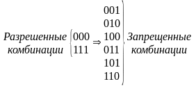 Чтобы эти подмножества не пересекались, хэммингово расстояние между разрешенными кодовыми комбинациями должно быть не менее трех. При n=3 за разрешенные кодовые комбинации можно, например, принять 000 и 111. Тогда разрешенной комбинации 000 необходимо приписать подмножество запрещенных кодовых комбинаций 001, 010, 100, образующихся в результате двоичной ошибки в комбинации 000.