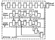 Одновременно по цепи обратной связи с выхода детектора подается сигнал «1» на входной сумматор регистра второй схемы деления. Этот сигнал изменяет выделенный синдром так, чтобы он снова соответствовал более простому типу ошибки, которую еще подлежит исправить. Продолжая сдвиги, обнаружим и другие выделенные синдромы. После исправления последней ошибки все ячейки декодирующего регистра должны оказаться в нулевом состоянии. Если в результате автономных сдвигов состояние регистра не окажется нулевым, это означает, что произошла неисправимая ошибка.