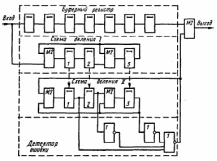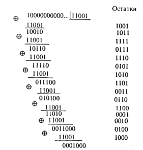 За первые n-k тактов коэффициенты многочлена-делимого заполняют регистр, причем коэффициент при х в старшей степени достигает крайней правой ячейки. На следующем такте «единица» делимого, выходящая из крайней ячейки регистра, по цепи обратной связи подается к сумматорам по модулю два, что равносильно вычитанию многочлена-делителя из многочлена-делимого. Если в результате предыдущей операции коэффициент при старшей степени х у остатка оказался равным нулю, то на следующем такте делитель не вычитается. Коэффициенты делимого только сдвигаются вперед по регистру на один разряд, что находится в полном соответствии с тем, как это делается при делении многочленов столбиком.