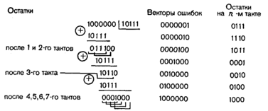 В зависимости от номера искаженного разряда после первых тактов будем получать различные остатки (опознаватели соответствующих векторов ошибок). Вследствие этого выделенный синдром будет появляться в регистре схемы деления через различное число последующих тактов, обеспечивая исправление искаженного символа.