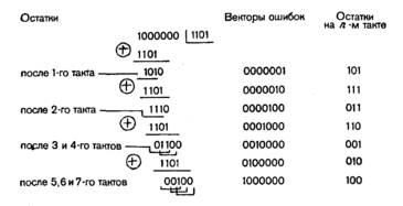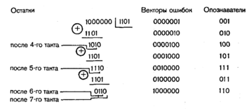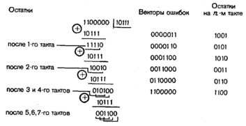 После n (в данном случае 7) тактов в схему деления II переписывается опознаватель ошибки 101.