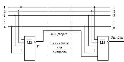 формируется признак четности Р числа, который в качестве дополнительного, (n+1)-го контрольного разряда (parity bit) отправляется вместе с передаваемым словом в линию связи или запоминающее устройство. Передаваемое (n+1)-разрядное слово имеет всегда нечетное число единиц. Если в исходном слове оно было нечетным, то инверсия функции М2 от такого слова равна 0, и нулевое значение контрольного разряда не меняет число единиц при передаче слова. Если же число единиц в исходном слове было четным, то контрольный разряд Р для такого числа будет равен 1, и результирующее число единиц в передаваемом (n+1)-разрядном слове станет нечетным. Вид контроля, когда по линии передается нечетное число единиц, по строгой терминологии называют контролем по нечетности.