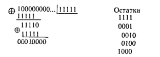 | 1 2 3 4 5 6 7 8 9 10 11 12 13 14 | 1 0 0 0 0 1 1 0 0 0 0 0 0 0 | 1 1 1 0 1 1 0 1 0 0 0 0 0 0 | 0 1 1 1 0 1 1 0 1 0 0 0 0 0 | 1 1 0 1 0 1 1 0 0 1 0 0 0 | Переписывается в схему деления II 1 01 001 1001 01001 101001 1101001 | |