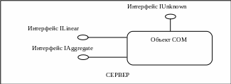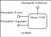 Предположим, что объект COM встроен в электронную таблицу и обеспечивает доступ к математическим операциям. Будет логично разделить математические функции на группы по типам и создать для каждой группы собственный интерфейс. Например, можно выделить линейные, тригонометрические, агрегатные функции и т.д. На рис. 1. объект расположен внутри сервера – электронной таблицы. Интерфейсы обозначены кружками, связанными с объектом. Пусть интерфейс линейных функций называется ILinear, а интерфейс агрегатных функций –IAggregate.