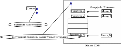 Доступный клиенту указатель интерфейса ссылается на внутренний указатель объекта и, через него, на специальную виртуальную таблицу. Эта таблица содержит указатели на все методы интерфейса.