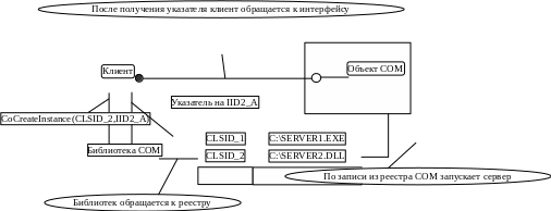 Следовательно, клиент не может получить указатели на объект и интерфейс. В этом случае он обращается к библиотеке COM и вызывает метод CoCreateInstance, передавая ей в качестве параметра CLSID нужного класса, IID интерфейса и требуемый тип сервера.