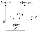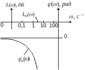 | 1) Tω<1, T2ω2<<1. При этом Lас=0 — низкочастотная асимптота (а — б). 2) Tω>1, T2ω2>>1. При этом Lас= –20lgTω — высокочастотная асимптота (в — г). При изменении частот в 10 раз: ω1=1c–1; ω2=10c–1. Lас1=–20lgT; Lас2=–20lgT–20.