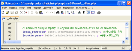 ● Рядом найдите строку "$rand_password=.." и "$cookie_pass=.." и впишите в обе переменных две разных строки из случайных символов.