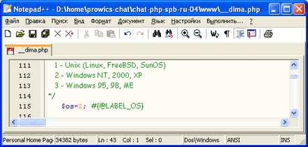 ● Откройте файл www/_dima.php. Найдите раздел "Название вашей операционной системы" и строку "$os=0". Впишите вместо нуля цифру 3, если у вас Windows 95/98/ME. Впишите вместо нуля цифру 2, если у вас Windows NT/XP/2000.