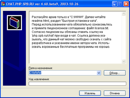 ● Запустите файл chat-php-spb-ru-04_60.exe (или другой, последней, версии). Нажмите кнопку ИЗВЛЕЧЬ и дождаться окончания распаковки. Появится каталог C:\WWW\CHAT-PHP-SPB-RU-04. Можно распаковать и в другие каталоги: