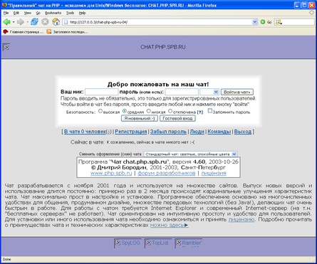 ● По настройкам PHP проверьте, что register_globals в on и magic_quotes_gpc в off. В чате есть защита от неправильной настройки этих двух параметров, поэтому не волнуйтесь, чат проверит их сам. Кроме того, используйте и качайте только последнюю версию чата.