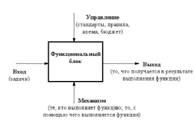 В терминах IDEF0 система представляется в виде комбинации блоков и дуг (см. рис. 11). Блоки представляют функции системы, дуги представляют множество объектов (физические объекты, информация или действия, которые образуют связи между функциональными блоками). Место соединения дуги с блоком определяет тип интерфейса.