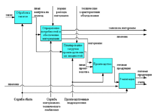 На рис. 5 представлена IDEF0-модель деятельности описанного выше предприятия. Методология IDEF0 реализуется с помощью пакетов ARIS, BPWIN.
