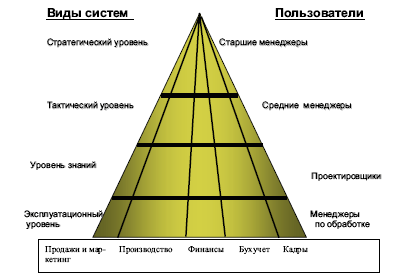 Организация имеет исполнительные системы поддержки руководства -Executive Support Systems (ESS) на стратегическом уровне; управляющие информационные системы - Management Information Systems (MIS) и системы поддержки принятия решений - Decision Support Systems (DSS) на тактическом (управленческом) уровне; системы управления знаниями — Knowledge Work System (KWS) и системы автоматизации делопроизводства - Office Automation Systems (ОAS) на уровне знаний; и системы обработки транзакций - Transaction Processing Systems (TPS) на эксплуатационном уровне.