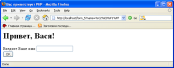 Если в поле форма name ввести, например, значение Вася, и нажать кнопку OK, то Браузер отправит после этого на сервер POST-запрос. Тело запроса имеет вид: name=Вася&okbutton=OK. PHP при этом автоматически заполнит массив $_POST: