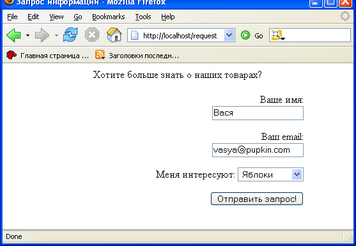 Теперь, если пользователь вызовет request.html и наберет в форме имя “Вася”, email: vasya@pupkin.com и скажет, что его интересуют “Яблоки”, а после этого нажмет "Отправить запрос!",