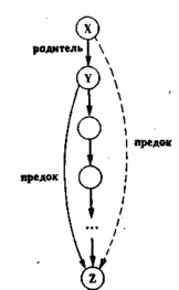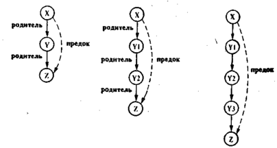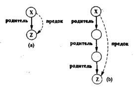 Пример отношения предок:(а) X - ближайший предок Z; (b) X - отдаленный предок Z.