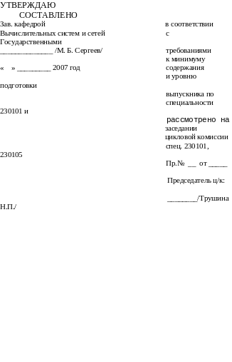 Задание на дипломное проектирование заполняется на бланке (приложение А) руководителем дипломного проекта, согласовывается с руководителем преддипломной практики, рассматривается на заседании цикловой комиссии и утверждается Зав. кафедрой 44 Сергеевым М.Б.