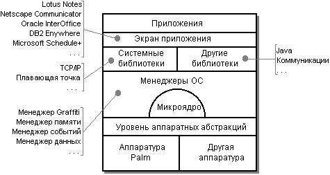 PalmOS базируется на микроядре. Вокруг микроядра построены системные службы - менеджеры PalmOS, представляющие собой наборы модулей, обеспечивающих определенные функции. К таким менеджерам относятся, например: