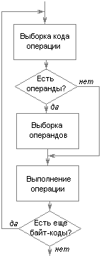 Команды Java VM состоят из однобитного кода операции, а также могут содержать операнды. Число и размер операндов определяются кодом операции, некоторые команды не имеют операндов. Основной алгоритм работы Java VM сводится к простейшему циклу, приведенному на рисунке 13.4.