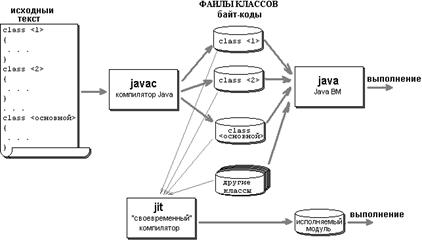 Итак, Java-программа выполняется в режиме интерпретации. Хотя фирма Sun Microsystems декларирует эффективность в числе основных свойств Java-программ, в отношении быстродействия это утверждение, мягко говоря, сомнительно. Интерпретируемая программа в принципе не может выполняться так же быстро, как программа в целевых кодах. Эффективность работы Java-программ зависит от эффективности работы Java VM, и Java VM разных производителей существенно различаются по этому показателю (лидером является фирма IBM). В составе средств разработки Java имеются также "своевременные" (just-in-time) компиляторы (JIT), которые транслируют байт-код Java в коды целевой платформы, результатом чего является исполняемый модуль в формате целевой платформы и системы. Такой модуль выполняется без участия Java VM, и его выполнение происходит эффективнее, чем выполнение интерпретируемого байт-кода, но это уже выходит за пределы платформы Java.