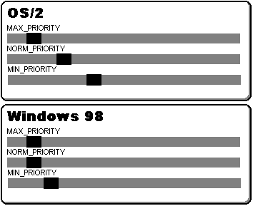 Для нитей в Java предусмотрено управление приоритетами (методы getPriority(), setPriority()), однако, и здесь Java использует механизмы управления приоритетами ОС. Так, уже классическим для учебников по Java является пример аплета, в котором по экрану "наперегонки" движутся несколько объектов, движение каждого осуществляется в отдельной нити и с собственным приоритетом. Этот пример весьма наглядно демонстрируется в средах, например, OS/2 и Linux, но выглядит не очень убедительным в среде Windows 95/98, так как приоритет нити не слишком влияет на скорость движения объекта - примерно так, как показано на рисунке 13.5.
