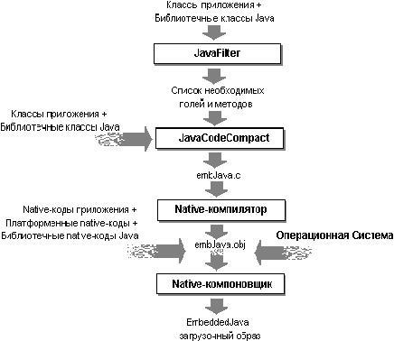 После определения необходимых компонент и создания компактных кодов и данных приложение совместно с компонентами среды выполнения компилируется в коды целевой платформы (native-коды), которые могут быть помещены в RAM- или ROM-память "тонкого" устройства. Общий ход процесса разработки приложения EmbeddedJava показан на рисунке 13.7.