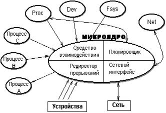 Микроядро QNX имеет минимальный размер (всего 8 Кбайт), и в нем сосредоточены все операции, выполняемые в режиме ядра. Ядро не имеет процессов, его модули всегда выполняются в контексте процесса, их вызвавшего. Модули, сосредоточенные в микроядре, выполняют следующие основные функции: