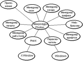Микроядро Photon, которое является процессом QNX, выполняет необходимый минимум графических функций. Микроядро Photon занимает всего 55 Кбайт памяти. Прочие части графической системы - также процессы, которые для выполнения базовых функций обращаются к микроядру Photon, используя средства взаимодействия, обеспечиваемые микроядром QNX. Менеджеры графической системы являются опционными, включение новых менеджеров расширяет функции системы. До некоторой степени ключевым компонентом, определяющим переход от интерфейса встроенной системы к WIMP-интерфейсу, является менеджер окон, который обеспечивает изменение размера, минимизацию, перемещение и т.д. для окон.