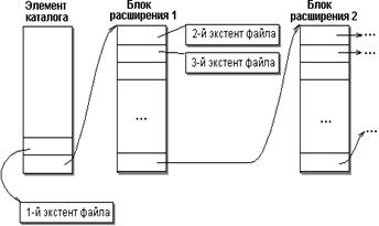 Единицей распределения дискового пространства является блок (512 байт). Пространство файлу выделяется экстентами - непрерывными последовательностями, состоящими из целого числа блоков. В элементе каталога, соответствующем файлу, содержится номер начального блока и размер для первого экстента файла. Если файлу выделено более одного экстента, то в элементе каталога содержится номер блока расширения, через который адресуются следующие экстенты файла. Если одного блока расширения недостаточно, последний элемент первого блока расширения адресует второй блок расширения и т.д.
