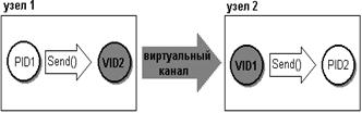 Виртуальный канал создается процессом-отправителем сообщения При этом на узле отправителя и на узле получателя создаются виртуальные процессы, каждый из которых представляет на локальном узле идентификатор процесса - удаленного корреспондента. Реальный процесс имеет реальный идентификатор (PID), виртуальный процесс - виртуальный идентификатор (VID). VID обеспечивает соединение, которое содержит следующую информацию: