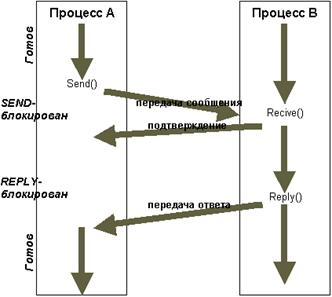 Для взаимодействия процессов необходима "встреча" готовности одного процесса (Процесса A) передать сообщение и готовности другого процесса (Процесса B) принять сообщение. При этом для процессов, участвующих в рандеву, нет необходимости знать о готовности процесса-корреспондента. Процесс, первым пришедший в точку рандеву, просто блокируется (SEND- или RECIVE-блокировкой) до готовности процесса-партнера.