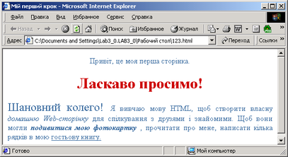 Якщо за допомогою броузера переглянути цей HTML-файл, двічі клацнувши на його піктограмі, на екрані він буде мати наведений вигляд (Рисунок 2) (зверніть увагу на розміри i написання шрифтів текстів "Привіт, це моя перша сторінка", "Ласкаво просимо!" i "Шановний колего!...", а також інші фрагменти тексту).