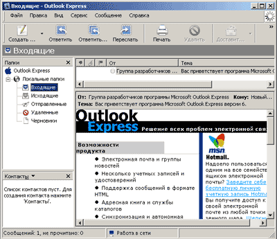 Грамотно реалізовано стартову сторінку поштового клієнта, на якій містяться посилання на всі основні дії з ним, а також довідка, що пов'язана з освоєнням програми. Outlook Express має широку довідкову систему, що докладно описує всі нюанси роботи з програмою.