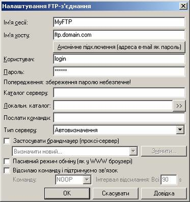 Host name (Ім’я хосту) — адреса FTP-сервера, наприклад, «ftp.domain.com»