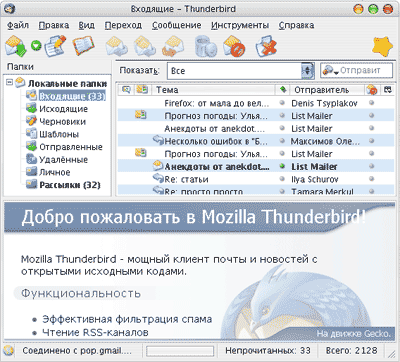 Mozilla Thunderbird не оптимізовано для роботи через модемне з'єднання. Проте при використанні широкосмугового підключення можна повною мірою відчути всю потужність клієнта. Висока безпека і відмінна робота з HTML - візитні картки Mozilla Thunderbird.
