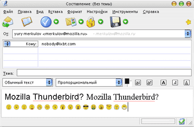 Mozilla Thunderbird має бібліотеку смайликов, але не обтяжчує повідомлення графікою. В листи додаються спеціальні HTML-теги, які інтерпретуються поштовими клієнтами як смайлики.