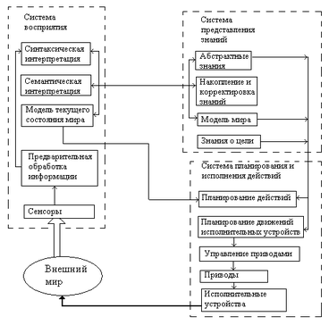 Обобщенная функциональная структура ИС показана на рис. . и включает три основные взаимосвязанные системы: восприятия, представления знаний, планирования и исполнения действий.